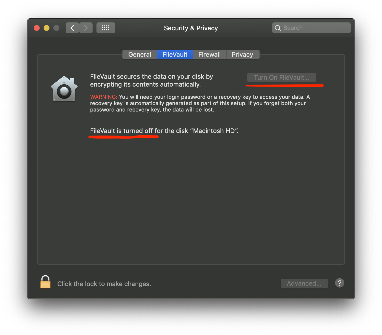 In macOS, open System Preferences. Go to Security and find the tab called “FileVault” — that’s what Apple calls full-disk encryption. Once you enable it, the system will generate a decryption key that you should note down (ideally a physical medium; definitely not on the same computer!) and store somewhere safe. If this key is lost and you ever forget your password, it will be impossible to recover any data. The encryption process should take less than 30 minutes to finish, and you can keep working while it happens.FileVault in macOS Mojave